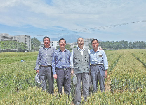 2010年5月,李晴祺教授(右二)考察我校小麦新品种时与部分科研人员合影。(左二为本文作者)